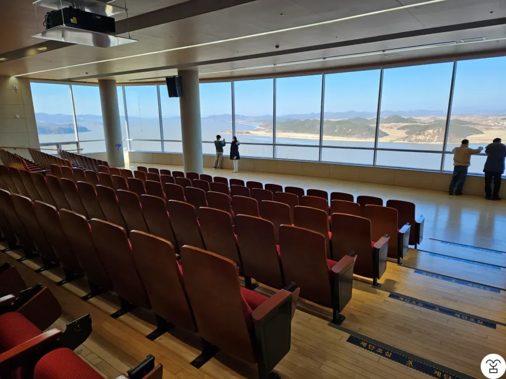 祖江展望台の内部および屋外からは北朝鮮の土地を見ることができ、北朝鮮が見える1階内部のいずれかのスペースで文化観光解説士による解説が行われるが、開始まで30分あったため個人的に忙しく、今回は聞かなかった。定期解説の時間は、第1回10時30分、第2回11時30分、第3回14時、第4回15時である。