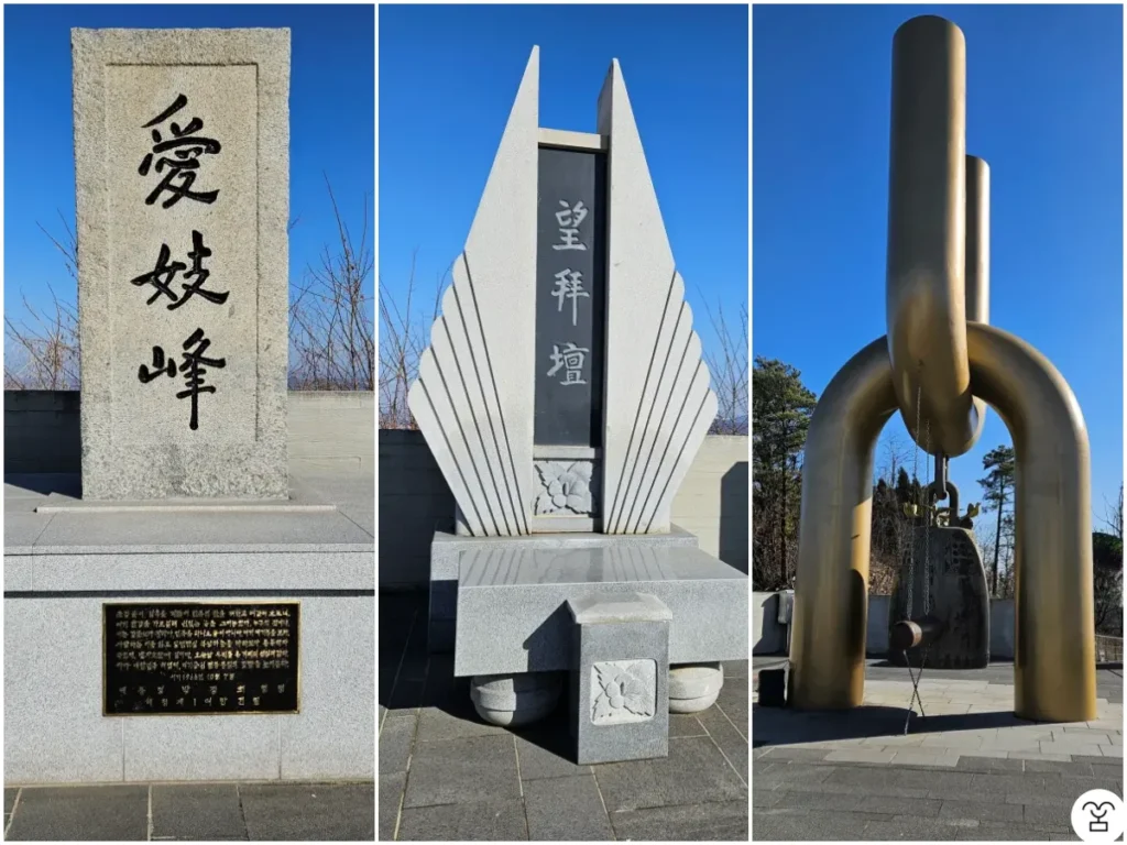 祖江展望台の周辺には愛妓峰碑、望拜壇、平和の鐘があり、いずれも一か所に集まっている。祖江展望台から平和生態展示館へ向かう道は二つあり、ジグザグ道を進んで吊り橋を渡るルートと、もう一つは下り坂を通るルートである。